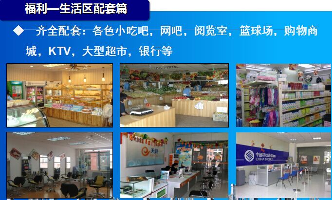 2、配套齐全,有各色小吃吧,网吧,阅览室,篮球场,购物商城,KTV,大型超市,银行等。